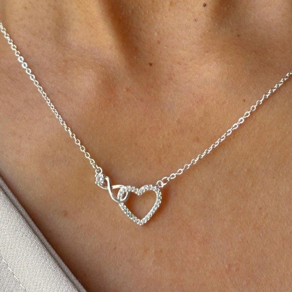 Conjunto de acero blanco con dije corazon con cubics e infinito.