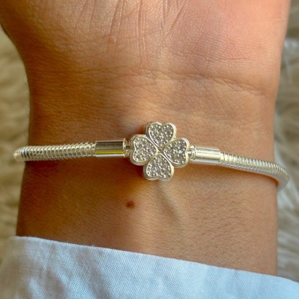Pulsera símil Pandora sin charms, con cierre trébol con cubics.