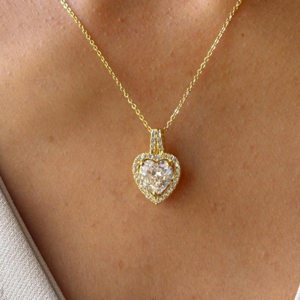 Conjunto de acero dorado, cadena y dje corazón con cubics blancos.