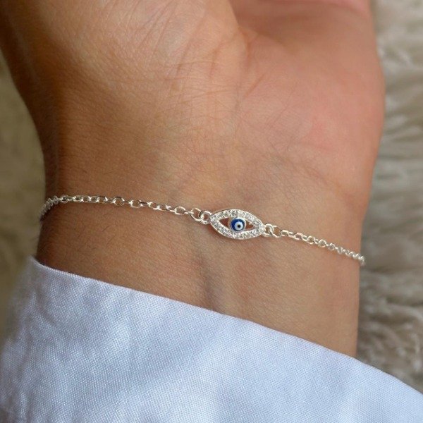 Pulsera fina de plata con dije ojo turco cubics blancos.