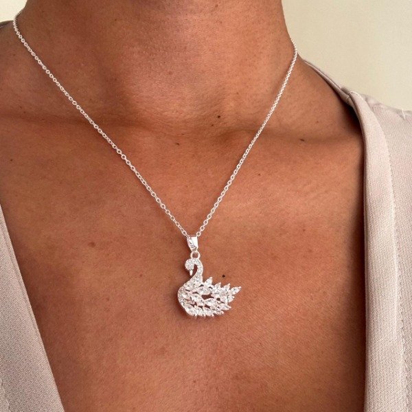 Cadena de acero blanco con dije forma de cisne con cubics blancos.